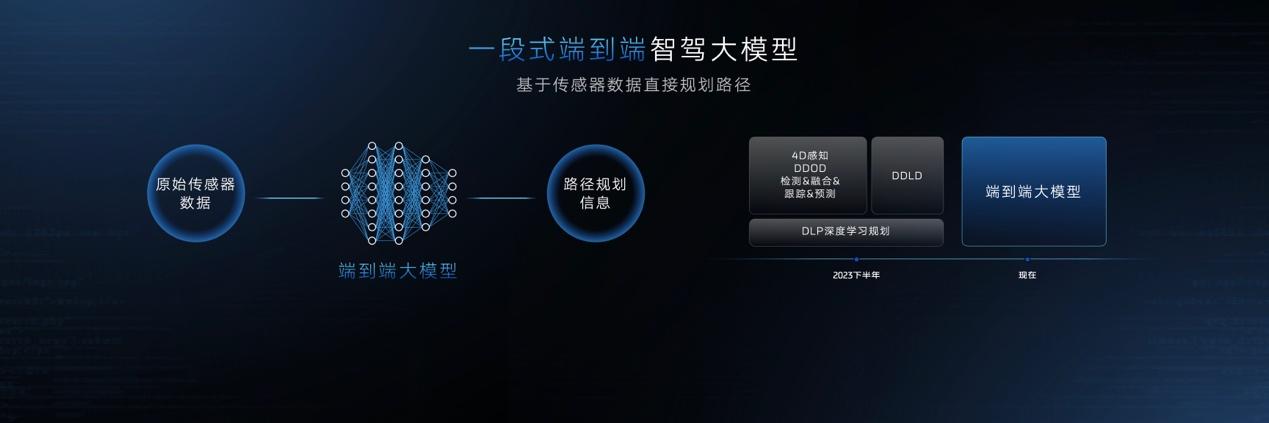 『一段式端到端大模型』则是对常见的端到端技术进行了进步的整合。据悉,『一段式端到端』取消了『感知+规划』这样的分模块的智驾结构,而是用一个通过来自数据飞轮提供的海量数据训练的完整的神经网络,通过来自各种传感器的原始数据,直接生成车辆的路径规划信息,当遇到未定义的物体时,智驾大模型可以学习和应对这一场景对应的驾驶行为。
